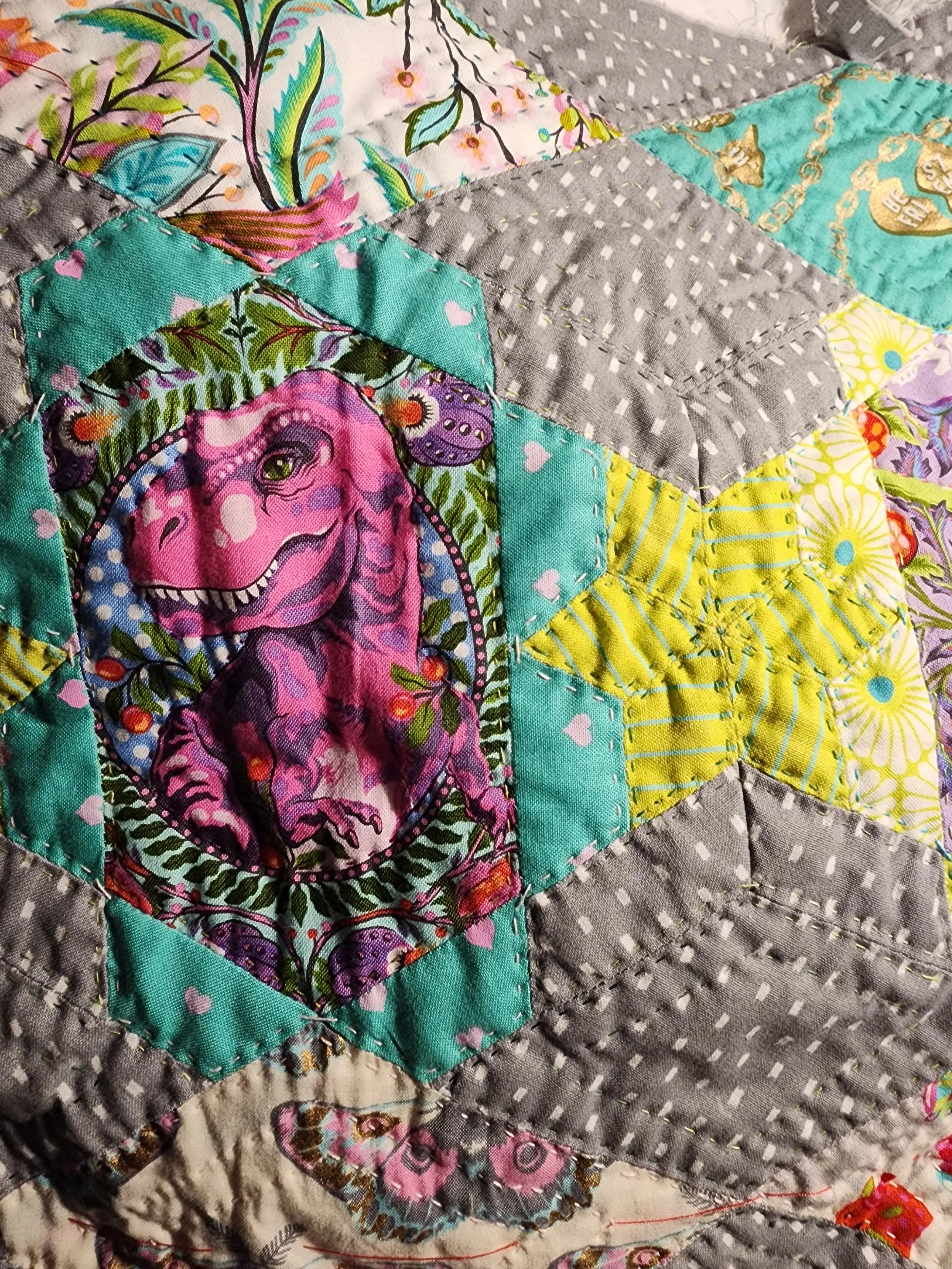 With Flores and Starburst taking center stage my goal will be to quilt one element of the quilt daily. So if you look at the picture to the right an “element” would be a 6-point star or one of the 3 or 4 inch diamonds, or the main block with the dino.