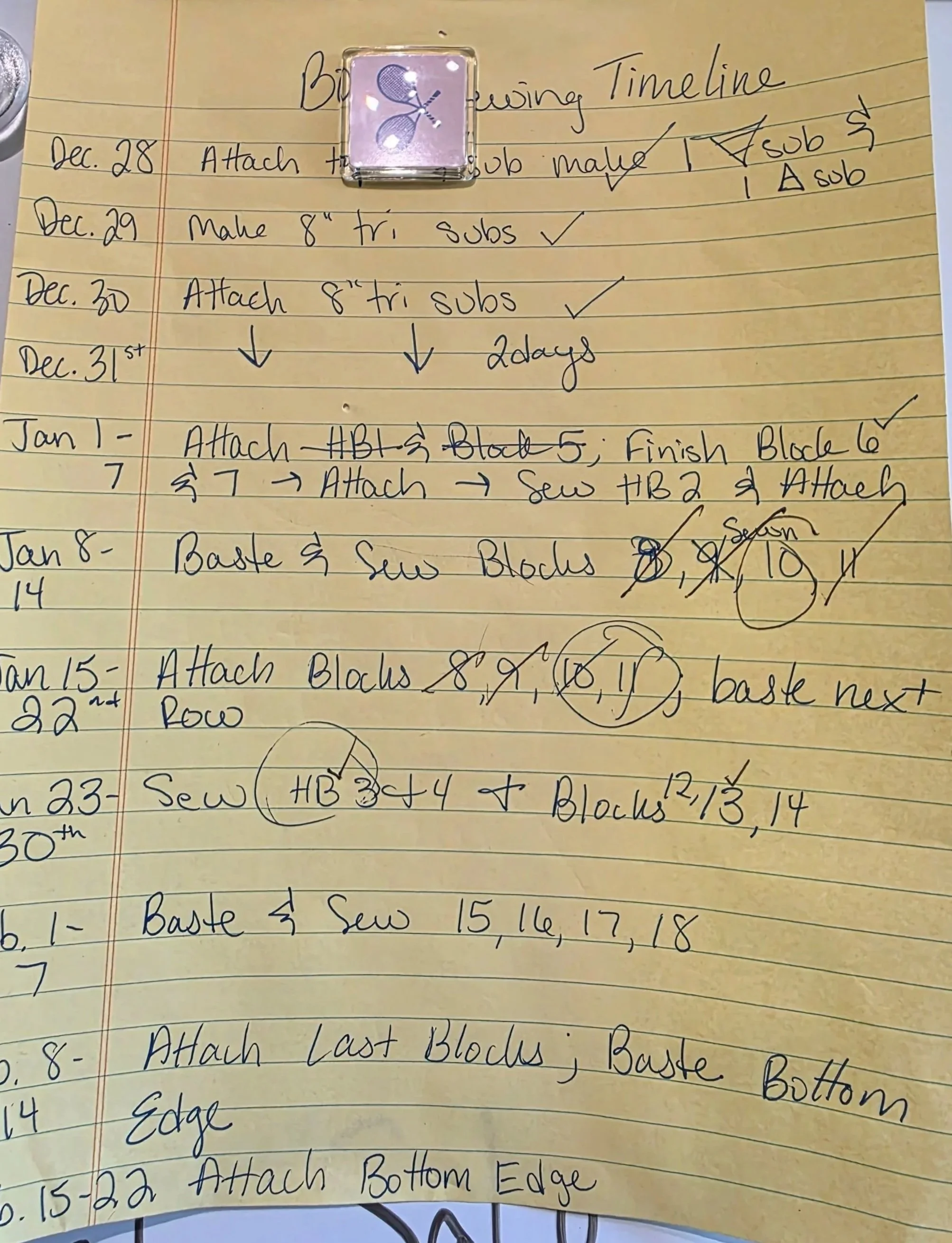 I like to work backwards if there is a “due date” so for me I have about 15 weeks before I need/would like to have the quilt top finished. From there I see where I am at with the project. Maybe you are already about halfway done, or maybe you are just starting the project. If you are just starting out or working to complete something the strategy is basically the same. Every EPP and quilting project is different, so find the best way to break it down (blocks, subunits, rows, rounds, etc.).